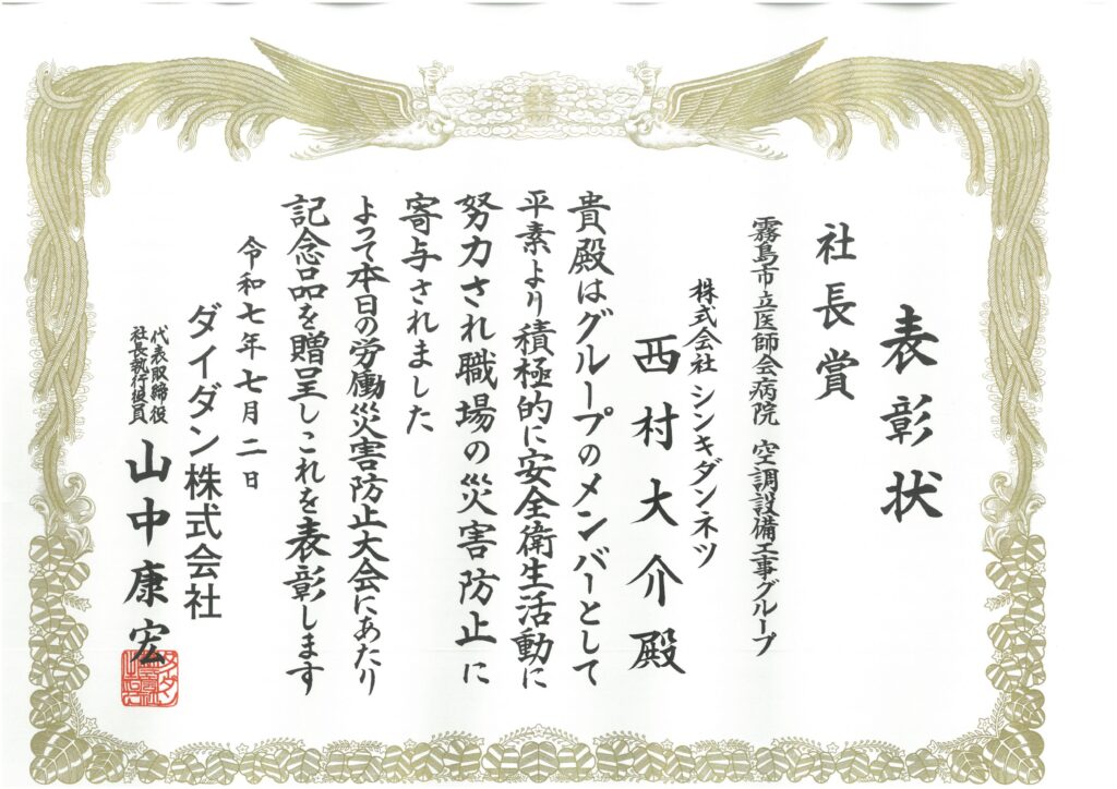 社長賞受賞のご報告 2025 10/29 このたび、ダイダン株式会社より社長賞を受賞いたしました。霧島市立医師会病院の現場において、メンバーの一員として災害防止に貢献したことが評価されたものです。 今回の受賞を励みに、今後も安全第一を心がけ、職場の災害防止と質の高い施工に一層努めてまいります。 お知らせ